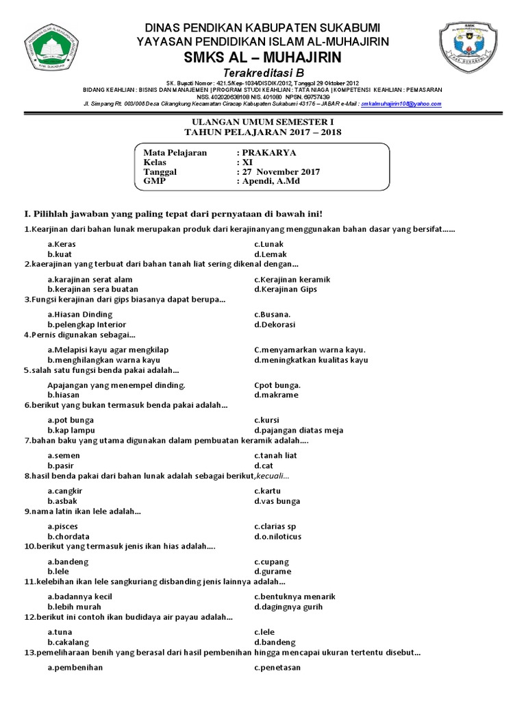Perlu diperhatikan jika soal tidak muncul, ini dikarenakan beberapa soal online pada situs ini menggunakan format swf (flash), jadi anda harus pastikan bahwa komputer anda sudah terinstall flash player, jika belum di install. Kali ini saya akan mencoba berbagi tentang materi pelajaran prakarya yang kesemua. Contoh soal pat prakarya smp/mts kelas 7 semester 2 (2). Pas prakarya kelas 8 semester 2 prakarya prakarya materi limbah keras prakarya smp smp soal prakarya smp kelas 8 semester 2 latihan soal prakarya pada post kali ini, kita akan berlatih soal mapel prakarya kelas 8 smp/ mts semester 2 bab 1 tentang kerajinan bahan limbah keras. Soal ukk ips kelas 7 8 semester 2 dan kunci jawabannya tahun 2018/2019 ini merupakan update terbaru soalukksmpsemester2.blogspot.com ya.
